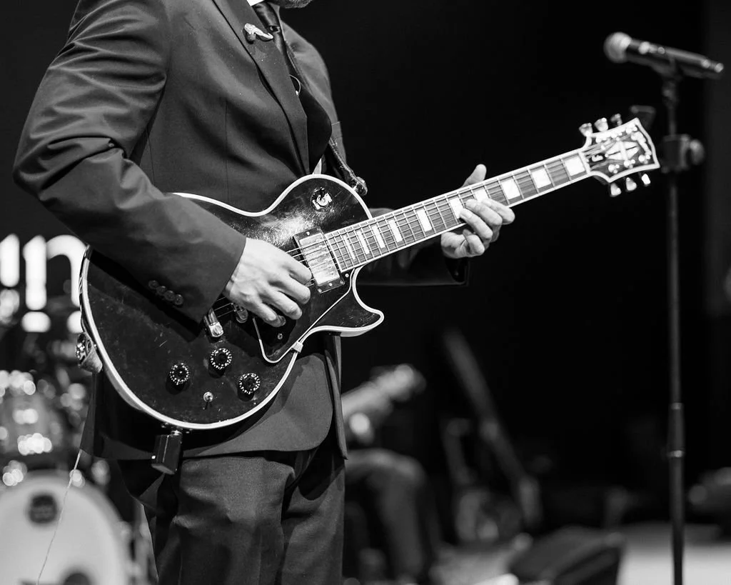 Person playing an acoustic guitar on stage, wearing a dark shirt, with a blurred orange-red light in the background.