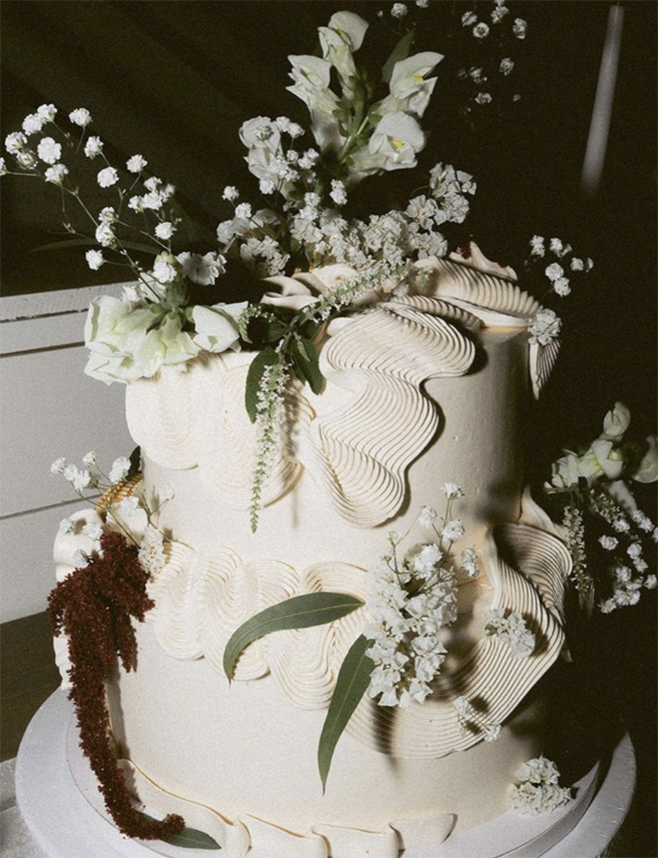 Rather than adding decoration, the cake itself becomes sculptural through surface detail alone. This approach aligns with weddings that prioritize materiality, softness, and restraint.